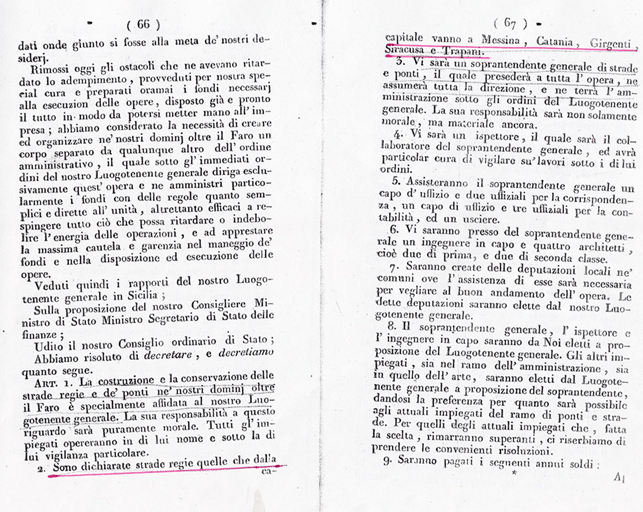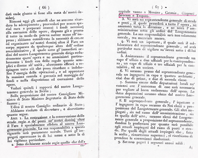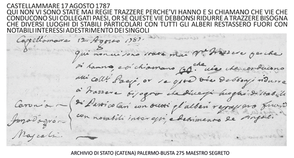 In chiusura mostro i seguenti documenti e carte; 1) Delibera del 1778 per la costruzione di ben otto strade che si collegato con le seguenti città: Agrigento, Sciacca, Mazara, Trapani, Messina, Caltagirone, Catania;