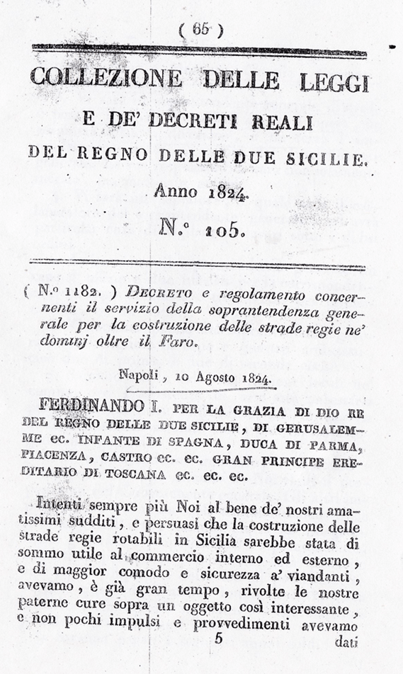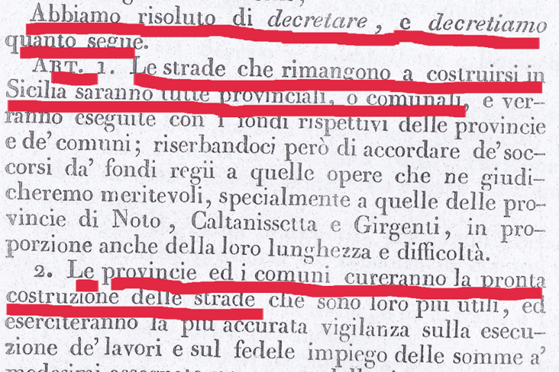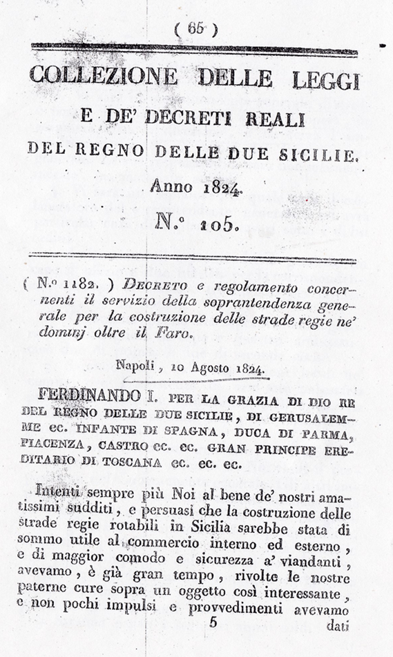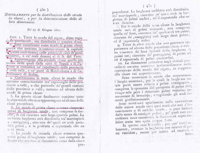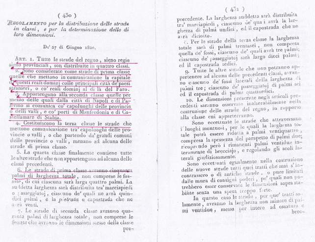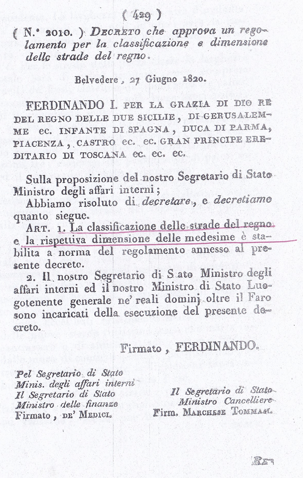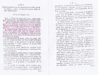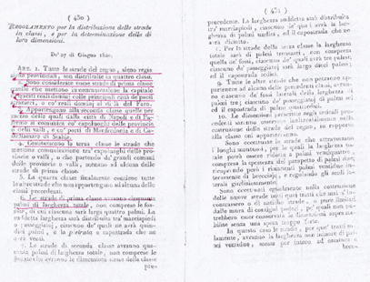 Dimostro subito che con i Regi Decreti del 1820-24 in basso riportati, le strade da costruirsi sono state distinte in quattro classi ad ogni classe è stabilita la larghezza e sono nominate strade Regie, Provinciali e Comunali.