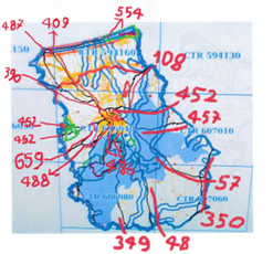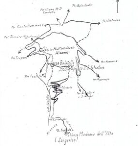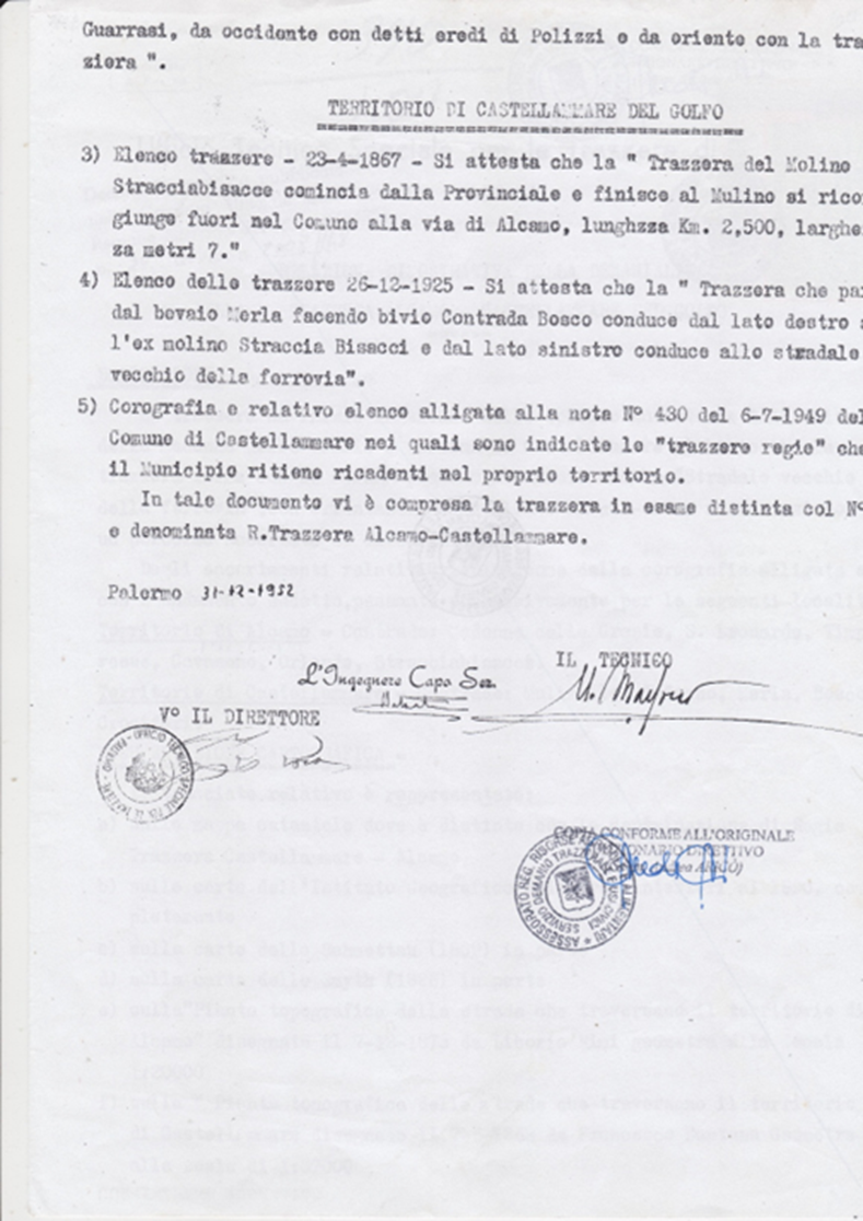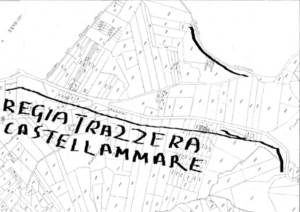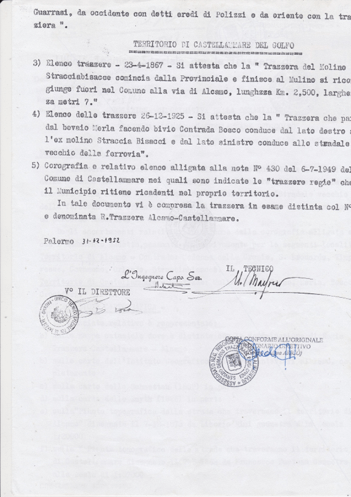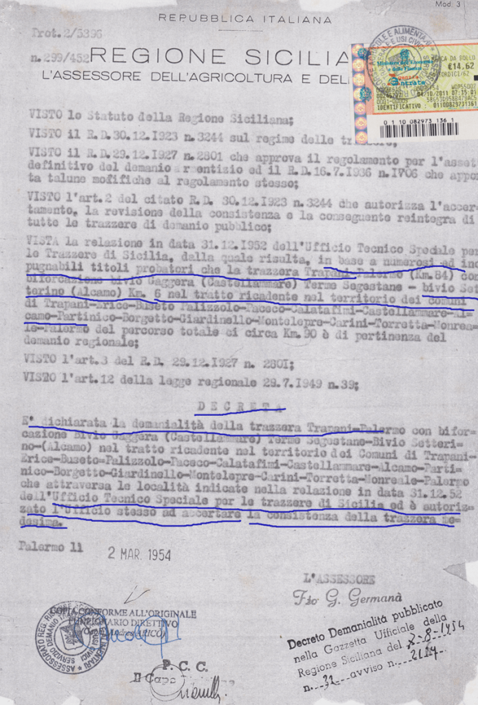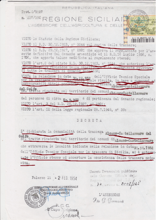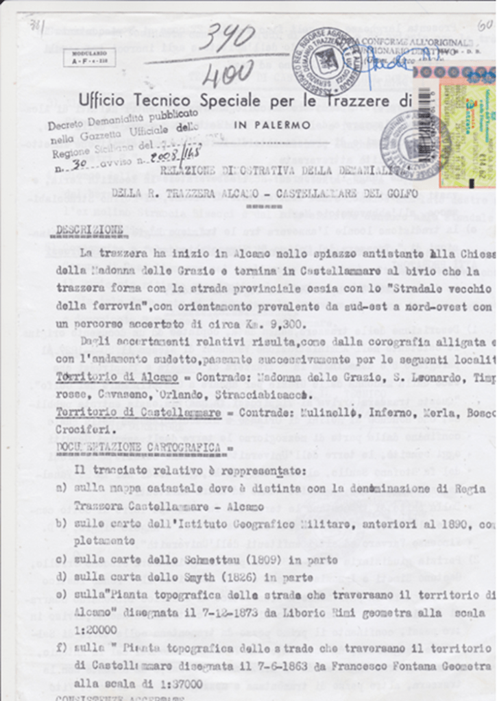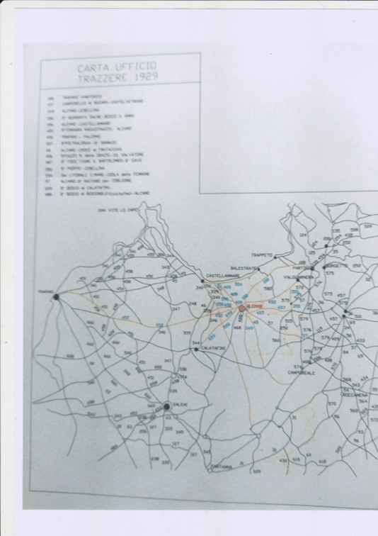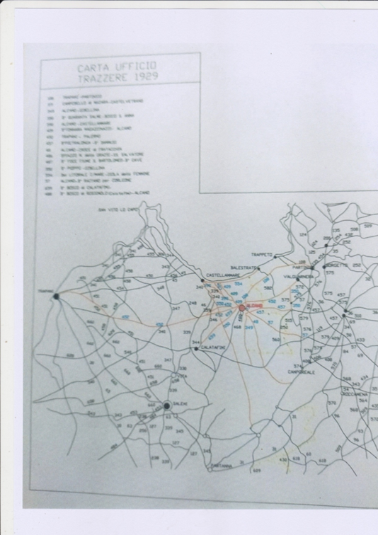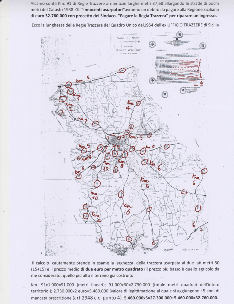 2)Il Marchese di Villabianca con la sua opera manoscritta del 1886 “NOTIZIA STORICA DELLE STRADE PUBBLICHE REGIE”, intanto ci mostra le vecchie e uniche strade costruite dai romani andate perdute e la necessità di costruire le “facili strade e bei cammini”; 3) Con Giuseppe Perez osserviamo la rete stradale costruita dai Borboni fino 1860 (unità d’Italia); 4) La rete stradale del golfo di Castellammare e di Palermo copiata dal Catasto Italiano del 1929 con i numeri dei decreti assessoriali divenute Regie Trazzere; 5) La tavola delle trazzere della Sicilia elaborata dal Catasto Italiano e pubblicata nella rivista del Catasto del 1° gennaio 1941; quella attaccata al fianco rappresentano rappresenta complessivamente le 11.500 chilometri di Regie Trazzere del patrimonio armentizio della Regione Siciliana. Vergogna!; 6) Infine, Alcamo attorniata da approssimate 80 chilometri di trazzere armentizie larghe metri 37,68.