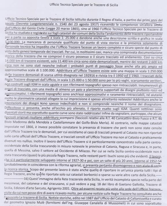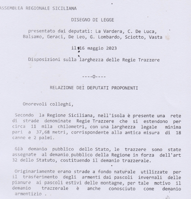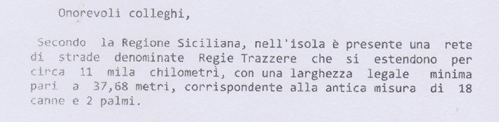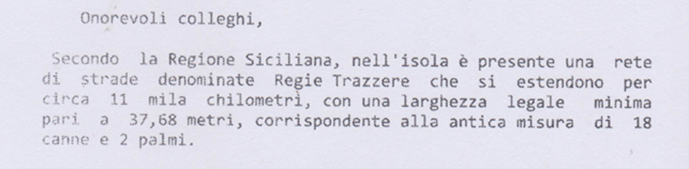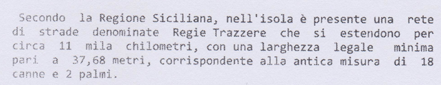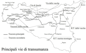 In Sicilia i Romani per motivi bellici (guerre puniche 210 a.C.) hanno costruito le strade sui tracciati dei “sentieri” percorsi dai Greci. Con la caduta dell’impero Romano nel tempo queste stesse strade sono andate perdute. Nell’intera Sicilia non esisteva rete stradale. Resta storico il ‘700 con il “Tour in Sicilia” dei visitatori stranieri(Inglesi, Francesi, Tedeschi e Italiani). Con l’anno 1778 nasce la necessità impellente della costruzione delle strade rotabili iniziata dai Borboni con i Regi Decreti 1820-1824 fino al 1860 e poi portata avanti dal Regno d’Italia fino al 1929 con le carte del Catasto Italiano. Nel 1901 nacque la Direzione Generale del Catasto e dei Servizi Tecnici con la legge n. 321 del 7 luglio 1901. A partire dal 1954 le strade del Catasto si allargano a metri 37,68 creando 11.500 chilometri di trazzere armentizie cinque volte maggiore dei Tratturi in assenza di carte e titoli demaniali. Le Vie della Transumanza dei “TRATTURI DI PUGLIA” tutt’oggi sono conosciuti e percorsi con festeggiamenti.