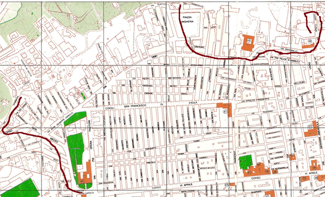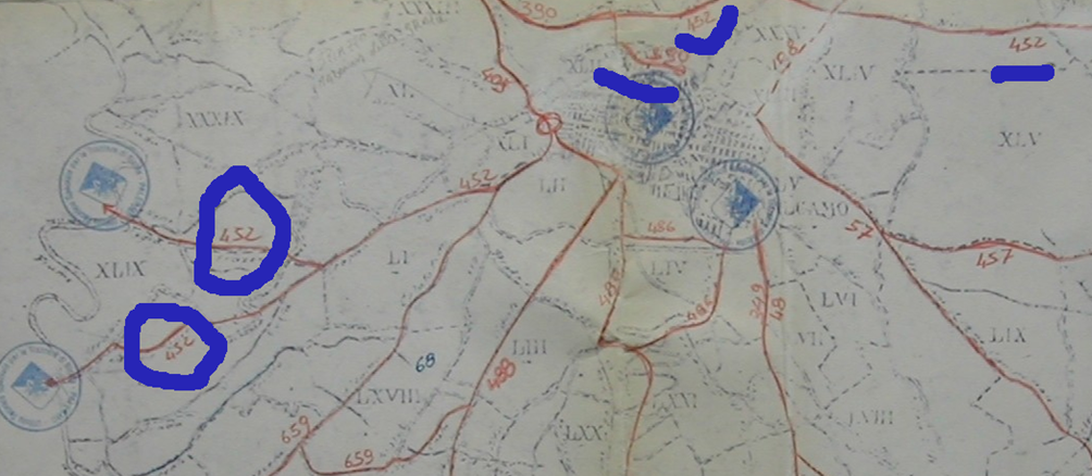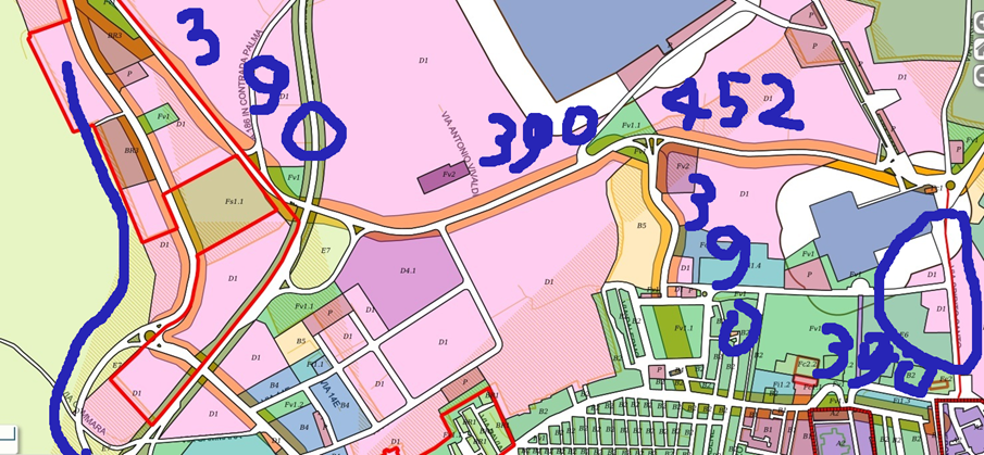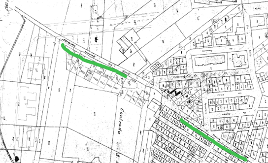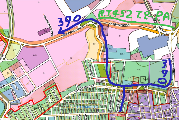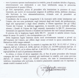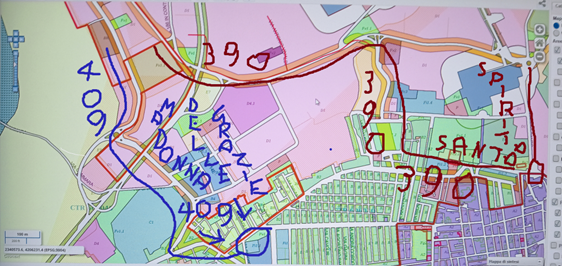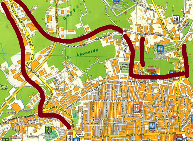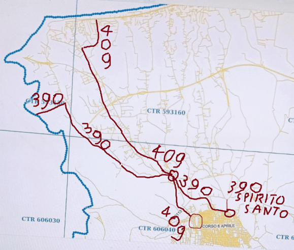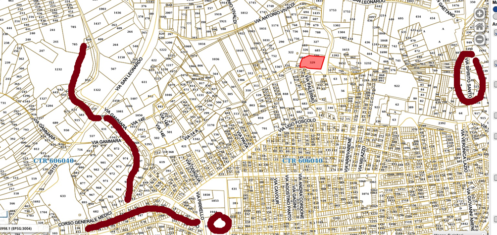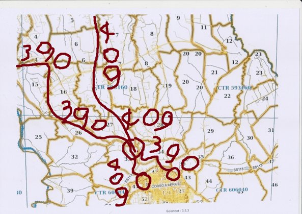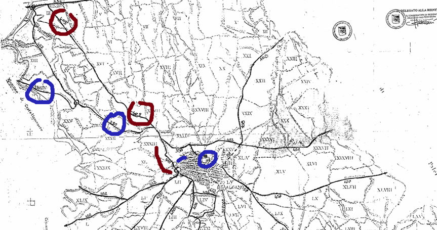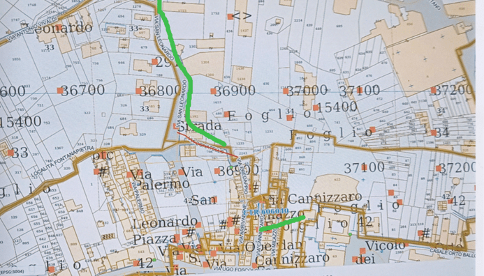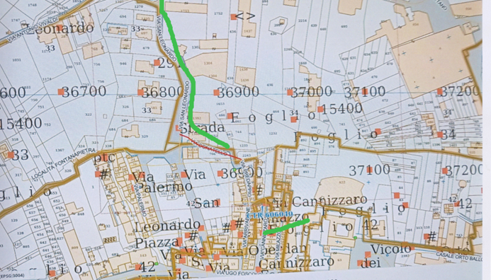 La carta parla e mostra chiaramente il Catasto particellare attuale, (impianto 1938) così sono pure trazzere armentizie le nuove strade costruite dopo il 1938. Le Vie nominate, Vivaldi, San Leonardo e così altre di colore bianco, portano la larghezza catastale (generalmente metri 4) quelle allargate e colorate arancione, verdi e giallastre diventano strade armentizie di metri 37,68. Forse non è un bell’affare disonesto a colpo d’occhio e senza fare calcoli.